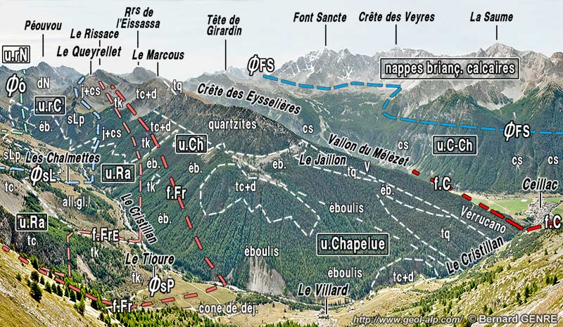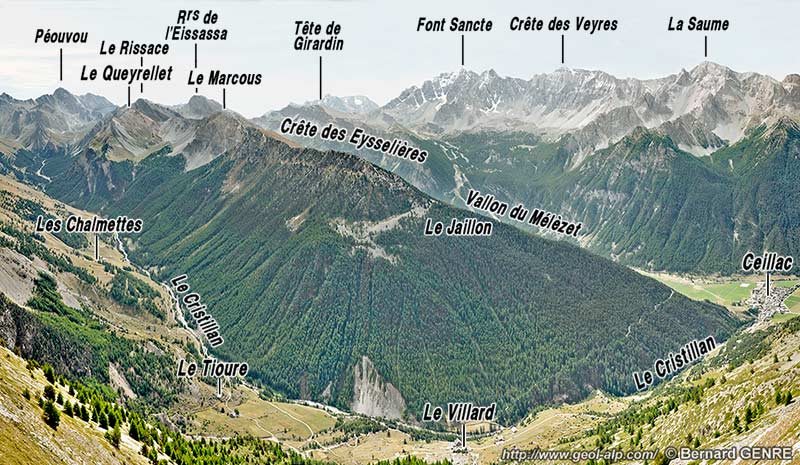- L'ensemble occidental, affleurant de la crête des Eyssellières à celle de Beaubardon, est une succession de couches typiquement briançonnaise en situation renversée (avec pendage vers le sud-ouest), qui est tranchée en biseau par la ligne de crête (Verrucano au nord dans la gorge de Ceillac et dolomies triasiques au sud sur la crête de Beaubardon). Il prolonge, au sud du tronçon SW-NE du Cristillan, le chaînon de Riou Vert et de Montbardon et constitue sans ambiguïté le prolongement méridional de l'unité de la Chapelue de la coupe du Guil (voir pages "Bramousse" et "Dent de Ratier"), dont la succession briançonnaise "classique" continue, ici aussi, à être disposée à l'envers.