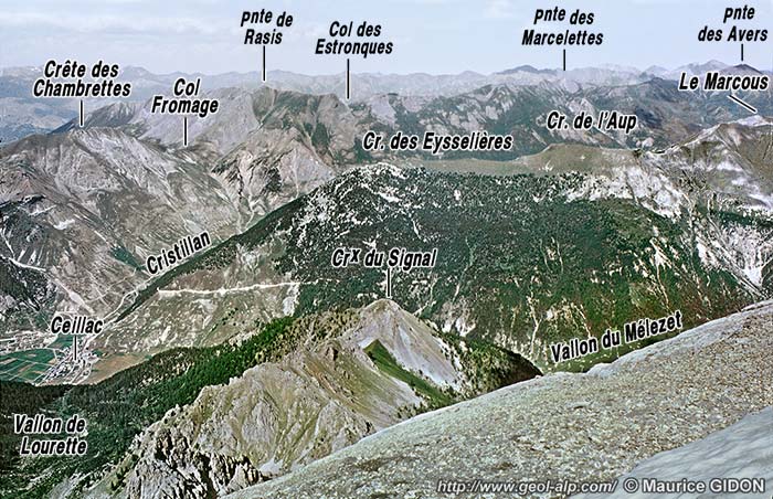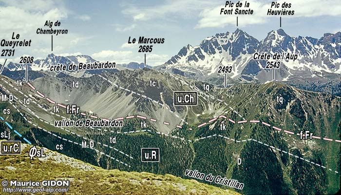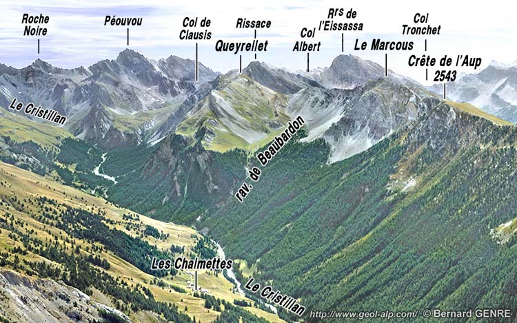 - L'ensemble oriental ne commence à affleurer qu'au sud du débouché du vallon de Beaubardon, dans les escarpements de rive gauche du Cristillan : ceux-ci se montrent d'abord constitués par les calcaires liasiques et des calcschistes jurassiques de l'unité piémontaise de la Roche des Clots, tandis que les plus basses pentes de ce versant montrent à leur tour les schistes lustrés du prolongement des unités ligures qui forment sur l'autre rive la Crête des Marcelettes (unité de Roche Noire).