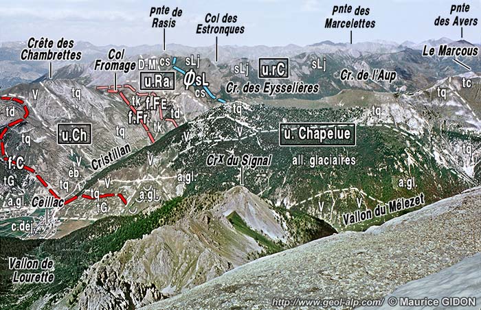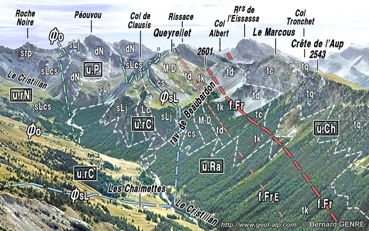Le versant septentrional de ce tronçon transversal du Cristillan, donne en coupe naturelle, le long de l'arête qui court d'ouest en est depuis la Crête des Chambrettes jusqu'à la pointe Rasis en passant par le col Fromage, la succession d'unités tectonique juxtaposées que l'on peut s'attendre à voir se prolonger plus au sud (voir les pages "Bramousse" et "Rasis", ainsi que la coupe, en fin de la présente page).