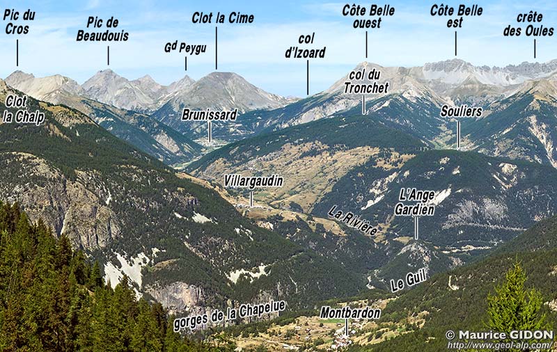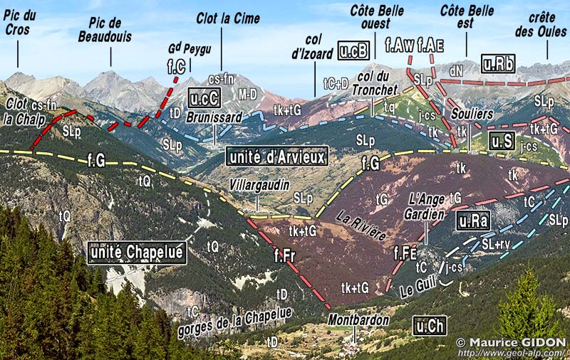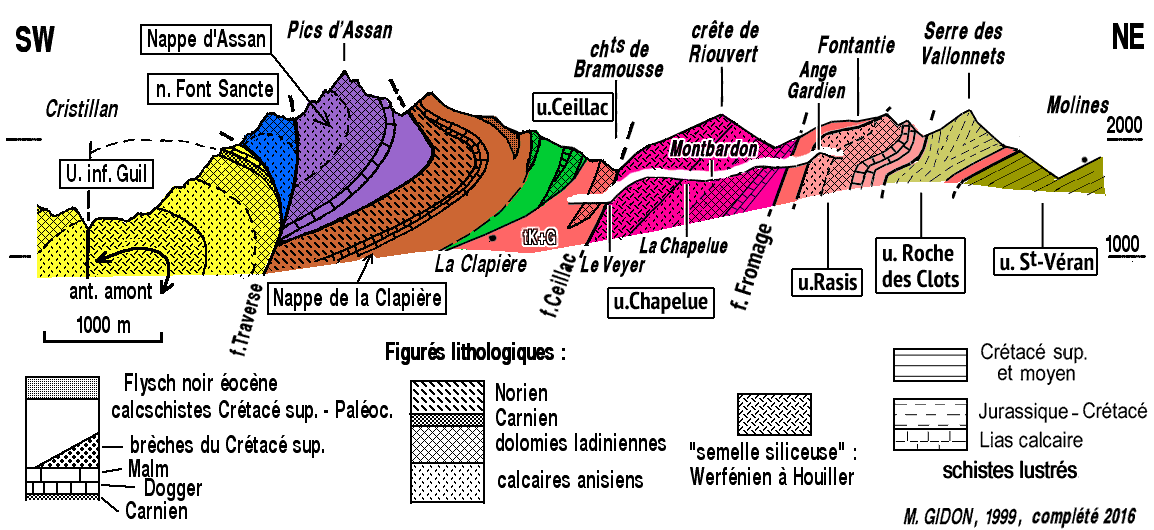![]() Coupe entre vallée du Guil et vallée du Cristillan (les couleurs individualisent les unités juxtaposées ; le rose brunâtre est la teinte unique correspondant aux diverses grandes bandes de gypses et cargneules) Cette coupe est orientée conformément au cliché précédent mais à l'envers par rapport aux suivants. |