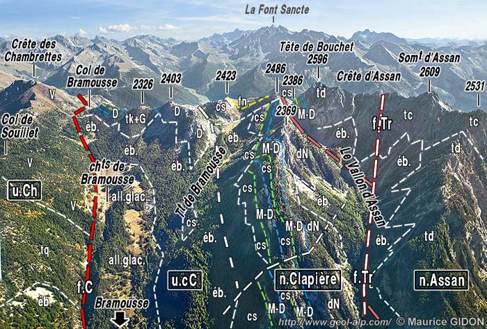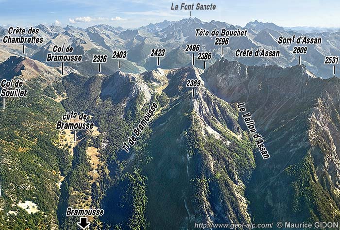Du côté ouest ses pentes sont couronnées par les abrupts de la crête orientale du Bois d'Assan (qui culmine au point 2486 et que le profond Vallon d'Assan sépare de la crête d'Assan) laquelle appartient à la nappe de La Clapière (voir la page "Ceillac") : les marbres en plaquettes de Bramousse s'avèrent y recouvrir, en contact stratigraphique les puissantes dalles verticales de dolomies noriennes qui constituent l'essentiel de cette crête. Leur disposition est due au fait que cette nappe est ployée avec celles qu'elle était venue recouvrir, par la retombée orientale de l'anticlinal amont du Guil.