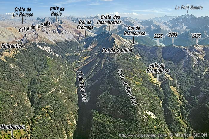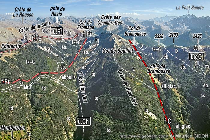 Du côté oriental de la faille du Col Fromage la bande gypso-cargneulique de Fontantie se développe en se rabattant vers l'est dans partie haute, jusqu'à envelopper la grosse échine de calcaires triasiques du Mont de Bramousse.