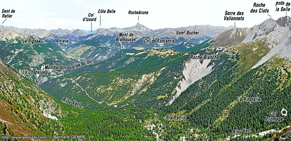 Dans cette partie de son tracé, méridionale par rapport au Guil, la bande cargneulique du col Fromage sépare donc les deux unités briançonnaises les plus orientales, celle de la Chapelue à l'ouest et, à l'est, celle de Rasis, à laquelle appartiennent, au nord des chalets de Fontantie, le Mont de Bramousse et les rochers de l'Ange Gardien.