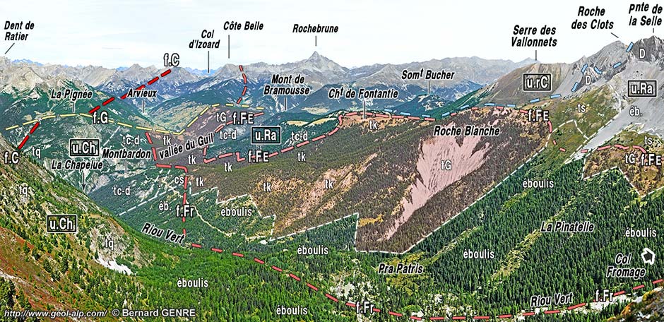 Dans le secteur du col Fromage cette bande de roches avait plutôt été interprétée comme la semelle stratigraphique de cette unité de Rasis, car les gypses semblent se compléter par des argilites du Trias supérieur au contact du Dogger des escarpements de la pointe de la selle. Il y a donc là une divergence d'interprétation concernant la signification structurale de ce matériel gypso-cargneulique selon que l'on se trouve au nord ou au sud du Guil. Cette question est examinée à la page "Rasis". |