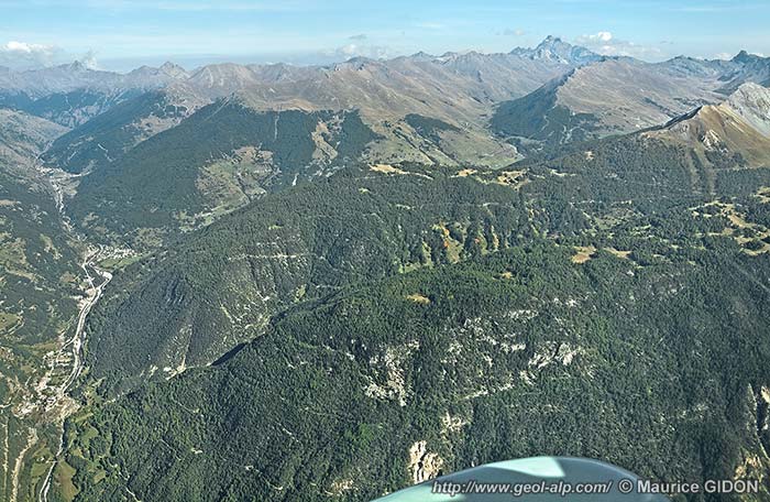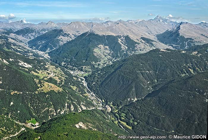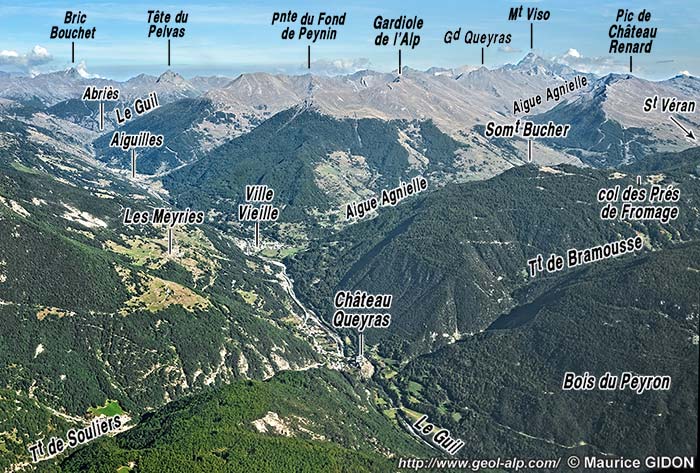 ![]() La vallée du Guil et sa rive gauche entre Chateau Queyras et Abriès, vue de l'ouest, d'avion. |