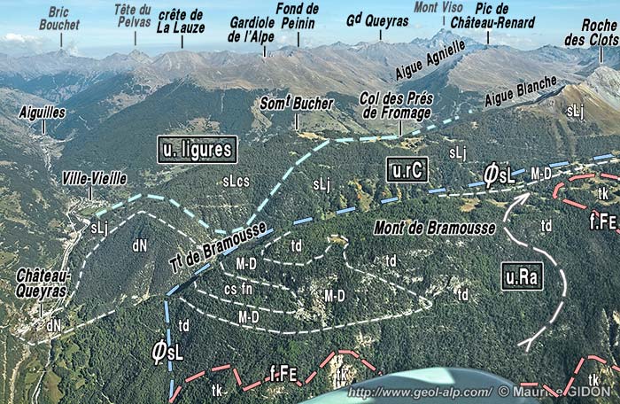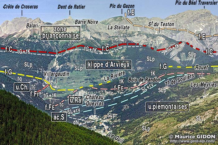 ![]() La citadelle de Château-Queyras vue de l'est, d'amont, depuis la rive gauche du Guil. En arrière-plan les crêtes de Ratier formées de matériel briançonnais riche en calcschistes (unité des calcschistes de Ceillac) ; derrière la citadelle les falaises du Bois de Randon sont formées par la lame de calcaires triasiques renversés de l'Unité de Rasis, qui est la plus interne des unités briançonnaises et sous laquelle s'engagent les schistes lustrés qui enrobent les calcaires du verrou de Château-Queyras. |