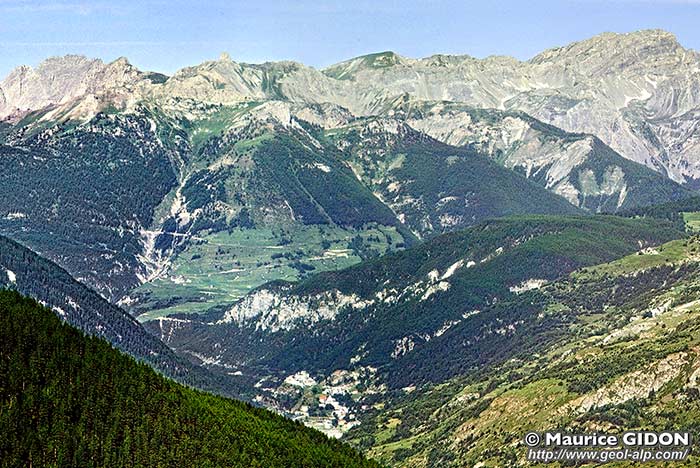 Les pentes orientales du massif de Peyre Eyraute (rive droite de la vallée d'Arvieux), vues de l'est depuis le hameau de Peynin, au dessus d'Aiguilles. |