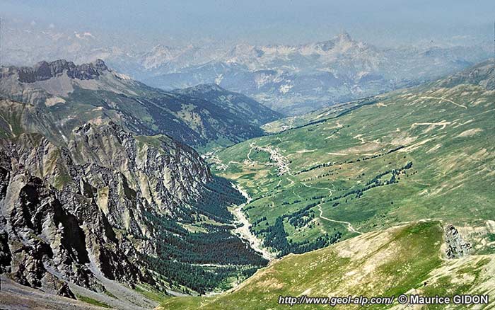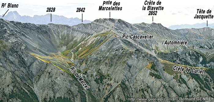 La crête de partage des eaux entre le Cristillan et l'Aigue Blanche est formée, en amont (sud-est) de Saint-Véran, par un puissant crêt*, orienté NW-SE, qui culmine principalement aux Pointes des Marcelettes (2909) et des Avers (3089).