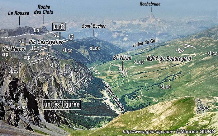 Ces analogies suggèrent que les "roches vertes" de Marcelettes pourraient représenter le prolongement nord-occidental de celles de Tête Noire.Toutefois, selon P.Tricart, la limite entre les marbres inférieurs (en flanc inverse) des Marcelettes et les schistes lustrés de l'unité de Tête Noire, sur lesquels ils reposent, correspondrait à un contact tectonique de rétro-chevauchement, responsable du sectionnement, au nord du Rocher de l'Automnière, des affleurements les plus septentrionaux de la lentille de roches vertes. |