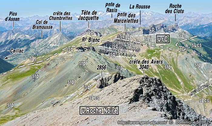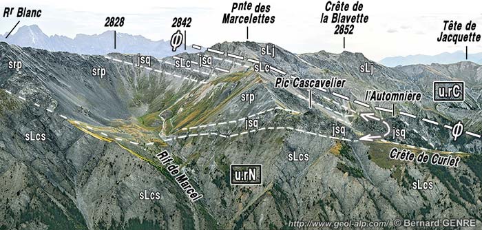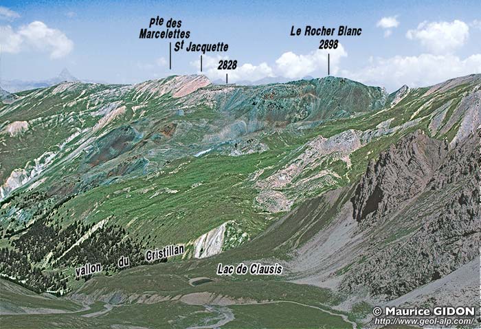 Au Rocher Blanc des Marcelettes on retrouve assez bien, à des différences de détail près, la succession observable plus au SE sur la crête du Cristillan, où elle caractérise l'unité de Tête Noire. On y observe en outre la même disposition tectonique caractérisée par le fait que la lentille de roches vertes (principalement de serpentinites) du Rocher Blanc occupe le cœur d'une synforme * anticlinale, qui se referme vers le bas dans les deux versant de la montagne : dans les abrupts du versant de l'Aigue Blanche la charnière du pli se ferme au niveau du Pic Cascavelier (voir cliché plus haut dans cette page).