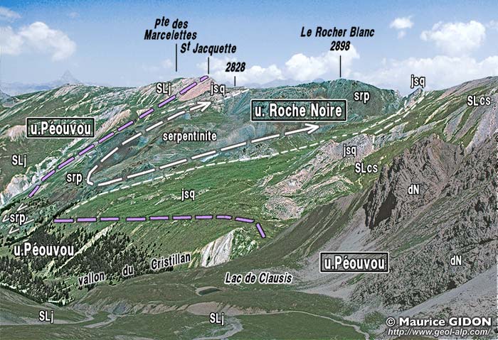 La structure de cette loupe d'ophiolites est également très comparable à celle de la Tête Noire de la crête du Cristillan. Elle en diffère cependant un peu en ceci que le pli est ici plus aplati et que son flanc normal est conservé au bord nord des affleurements. Ici son axe n'est pas orthogonal mais oblique à la crête et son plan axial plonge vers le nord-ouest, sous la crête des Marcelettes. Aussi voit-on sur cette crête (au point coté 2828) la couverture sédimentaire jurassique de ce flanc supérieur du pli s'enfoncer sous les calcschistes jurassiques de l'unité piémontaise externe de la crête des Clots (laquelle représente sensiblement le prolongement de celles des pentes orientales du Rissace, à l'ouest du Péouvou).