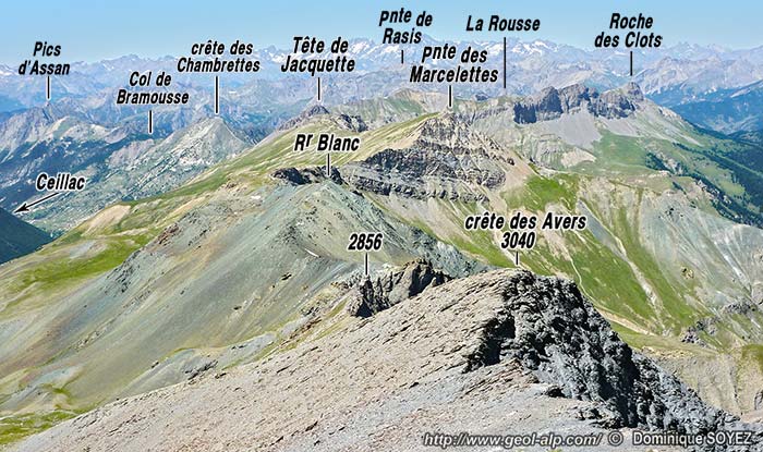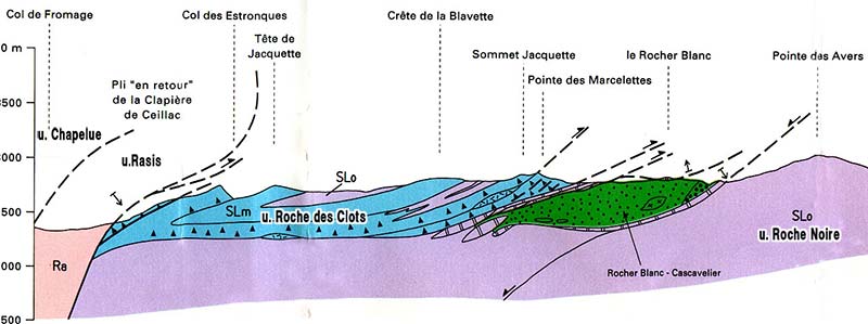 L'attribution de ces derniers à ce domaine sédimentaire y est bien caractérisée par le fait qu'ils hébergent une puissante masse de "roches vertes" qui affleurent sur la crête au Rocher Blanc (ce sommet est dénommé ainsi, en dépit de sa teinte très sombre,