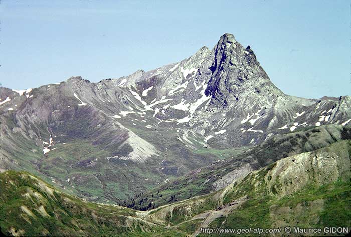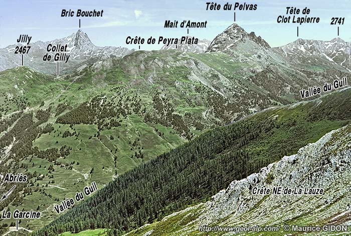 ![]() La crête de rive droite du Guil entre Abriès et Ristolas, vue du SW depuis le Col de la Lauze de Peynin. |