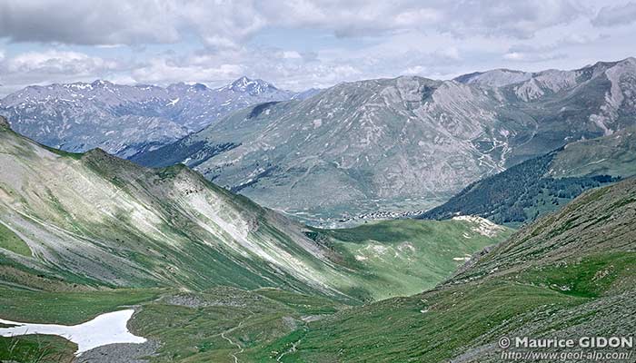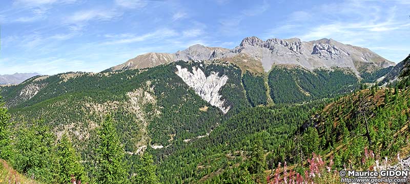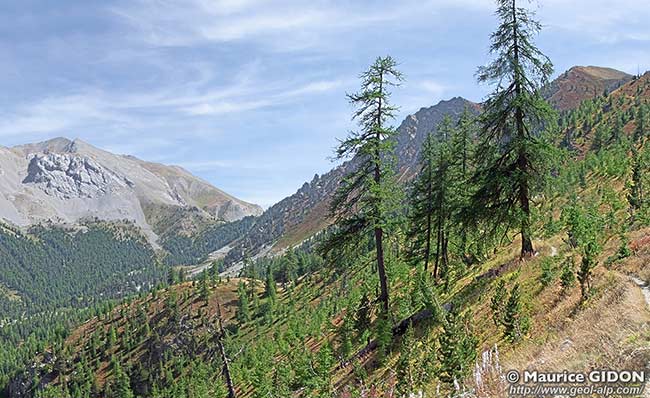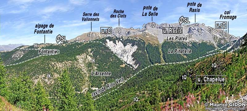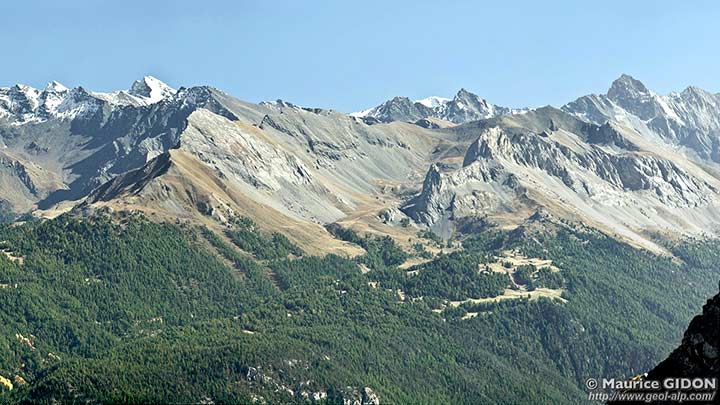 - Du coté ouest le chaînon du Bois de Riou Vert, qui culmine à la crête des Balmettes, est clairement rapportable à l'Unité de la Chapelue, en raison de la continuité d'affleurements de ses termes siliceux (quartzites et Verrucano) jusqu'aux gorges du Guil (où cette unité est définie : voir la page "Dent de Ratier"). Mais la limite occidentale de la bande gypseuse coupe en oblique les termes les plus élevés de cette unité, Trias calcaire puis Jurassique et enfin Crétacé : ces derniers, absents au niveau du col, réapparaissent en effet à tour de rôle plus au nord, dans les pentes de Montbardon.