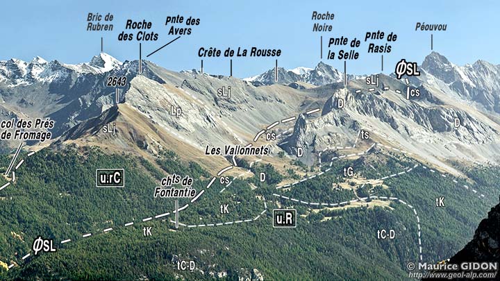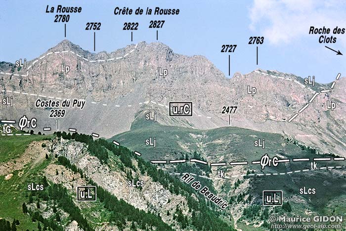 En fait les calcaires liasiques de cette longue barre de la Roche des Clots sont globalement en situation de cœur d'un pli couché, entre les couches jurassiques plus récentes (plus argilo-schisteuses). Ce style tectonique explique pourquoi ces couches réapparaissent de façon répétitive, à plusieurs niveaux dans la succession du versant est de la montagne, comme on le voit à l'extrémité sud de la crête principale, le long de la crête des Costes du Puy, au nord du vallon qui descend du col des Estronques (cliché ci-après).