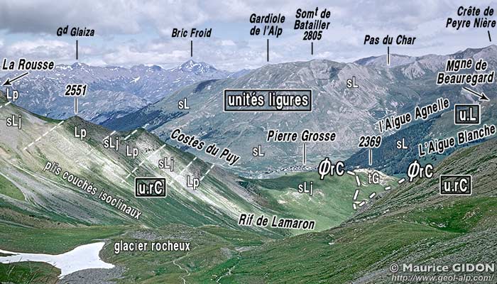 L'unité de la crête des Clots se poursuit sur près de 10 km vers le sud : à la latitude du col des Estronques elle traverse la vallée du Cristillan pour former les basses pentes orientales de la crête de Beaubardon (voir la page "Rissace") et de la crête du Rissace. Là elle se termine en n'étant plus représentée que par ses calcschistes jurassiques qui s'intriquent en replis avec les schistes lustrés ligures : cela suggère que la barre des calcaires liasiques se ferme aussi par des replis anticlinaux dans cette direction et donc que les plis qui l'affectent dessineraient probablement un anticlinorium* déversé vers le sud. |