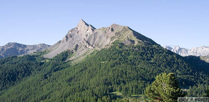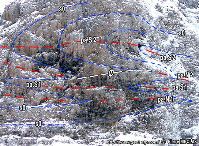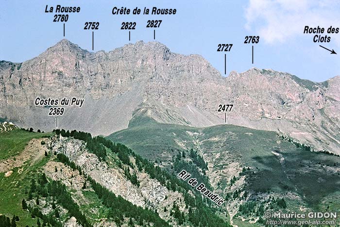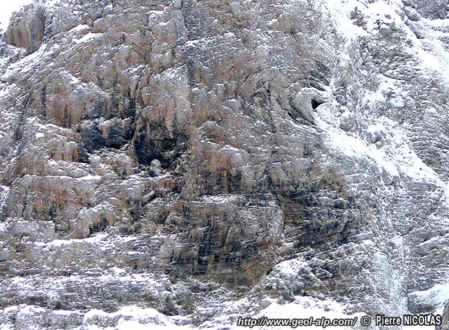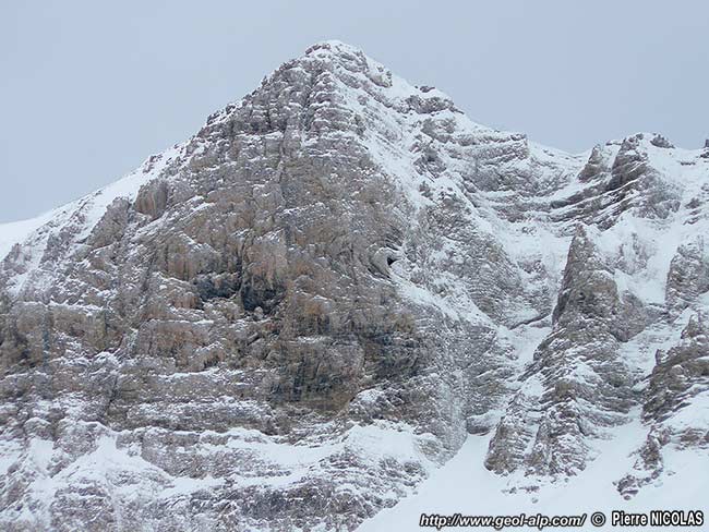 ![]() L'abrupt oriental du sommet de la Rousse (2780), vu de l'est depuis Saint-Véran.(cliché original obligeamment communiqué par Mr. P. NICOLAS) La neige souligne les bancs, ce qui met en évidence leur reploiement complexe en plis couchés très aplatis. |