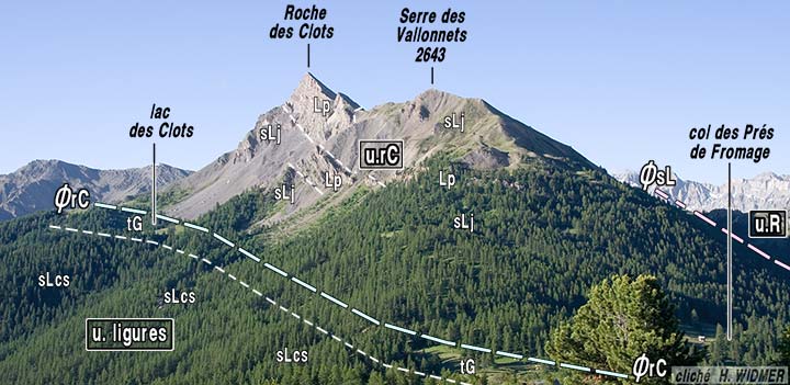 B/ L'unité de la Roche des Clots est armée par les calcaires liasiques : ce sont plus précisément ces derniers qui forment la partie la plus acérée de l'arête en forme de crêt regardant vers l'est, qui court du nord (Serre des Vallonnets) au sud (La Rousse). elle couronne de ce côté les pentes de rive gauche de la vallée de l'Aigue Blanche en amont de son confluent avec l'Aigue Agnelle.