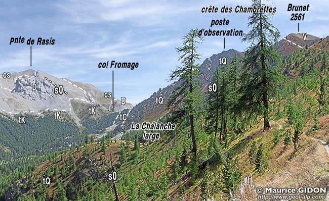 A/ L'unité de Rasis est limitée du côté occidental par une importante bande de gypses et cargneules qui détermine le col de Fromage, entre la Crête des Chambrettes à l'ouest et la Pointe de Rasis à l'est.
