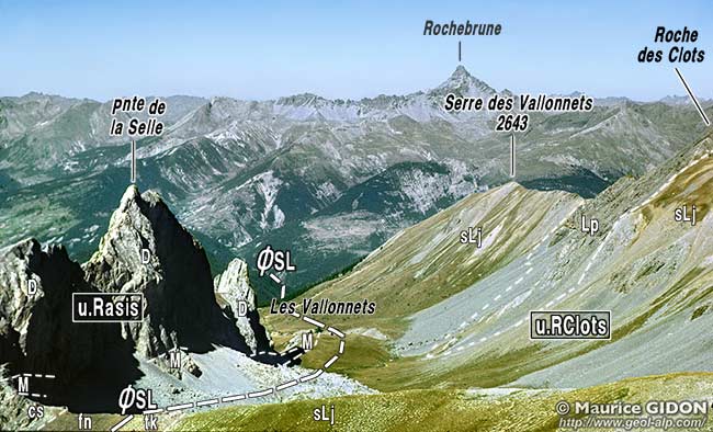 - celle, occidentale, de la Selle, franchement rocheuse, est une lame, redressée aux approches de la verticale, de calcaires du Jurassique moyen et supérieur, que flanquent du côté oriental marbres en plaquettes et flysch noir, le tout bien caractéristique de la zone briançonnaise : c'est l'unité de Rasis ;