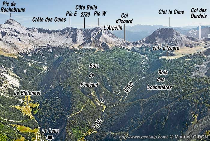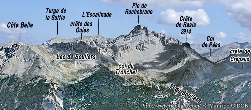 Le versant méridional de la montagne se résume en effet aux abrupts d'une crête orthogonale orientée E-W, donc perpendiculaire aux lignes principales de la structure de la région. Elle court depuis le sommet du Pic de Rochebrune jusqu'au Pic oriental de Côte Belle (crête des Oules) en dominant les vallons de Souliers et de Péas, affluents de rive droite du Guil. La coupe transversale naturelle donnée par ce versant montre parfaitement que ces crêtes sont formées par une énorme dalle de dolomies noriennes dont les couches sont presque horizontales. On voit clairement en outre, à la faveur de la profondeur de l'entaille d'érosion due à ces vallons, que cette dalle repose sur toute sa transversale, soit sur plus de 2 km de largeur d'est en ouest, sur des schistes qui forment les pentes d'alpages et de bois du versant queyrassin. On peut y distinguer, s'intercalant sur les vrais schistes lustrés à ophiolites du col de Péas, une tranche supérieure de schistes jurassiques de type prépiémontais, qui prolonge très vraisemblable l'unité du Bois des Coins du versant nord et celle de la Roche des Clots en rive sud du Guil.