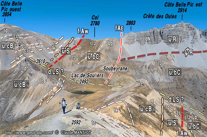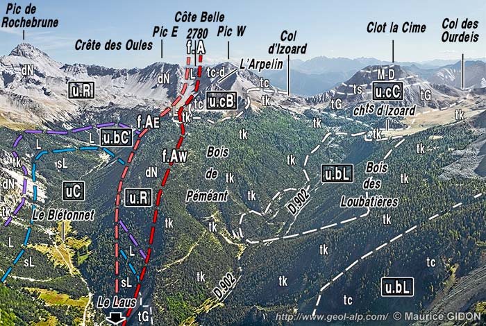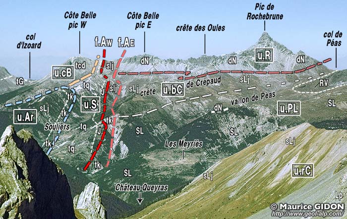 Le versant méridional du chaînon de Rochebrune vu du sud, depuis le col entre la Pointe de Rasis et la Roche des Clôts (rive gauche du Guil, Queyras). f.AW, f.AE = branches ouest et est du prolongement sud de la faille des Acles. u.cB = unité briançonnaise de Côte Belle - Arpelin ; u.Ar = unité piémontaise externe d'Arvieux ; u.S = unité de Souliers (J = jurassique reposant stratigraphiquement sur les quartzites) ; u.bC = calcschistes jurassiques "sLj" et les calcaires liasiques "L" de l'unité piémontaise externe de la crête de Crépaud : il s'agit de la réapparition de l'unité du Bois des Coins du versant de Cervières ; u.rC =unité piémontaise externe de la Roche des Clots (premier plan droit), son prolongement probable ; u.R = unité piémontaise externe de Rochebrune ; u.PL = unités piémontaise ligures de schistes lustrés à "roches vertes" (voir la page "Agrenier") |