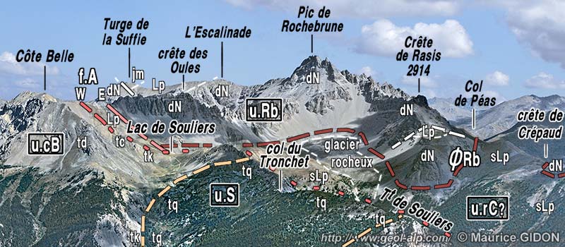 ![]() Le versant méridional de la montagne de Rochebrune, vu du sud-ouest, depuis le sommet du Pic du Gazon de Furfande (voir les pentes inférieures de ce versant à la page "Arvieux"). u.cB = unité briançonnaise de Côte Belle ; f.A = faille des Acles (branches ouest et est) ; u.S = unité ultra-briançonnaise de Souliers (en disposition renversée) ; u.Rb = unité piémontaise de Rochebrune ; u.rC? = unité des schistes lustrés piémontais prolongeant ceux de la Roche des Clots (rive sud du Guil). |