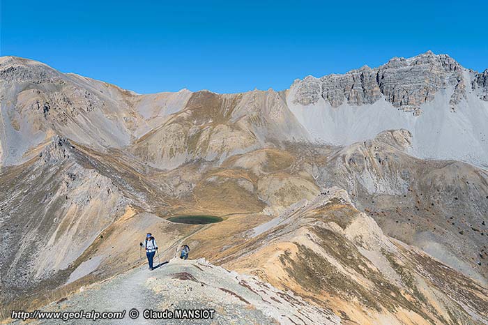 Cette juxtaposition se fait par l'intermédiaire du tronçon à cette latitude de la grande faille des Acles. C'est en effet là que conduit le tracé cet accident majeur qui sépare les deux domaines briançonnais et piémontais sans les imbriquer (c'est la cassure la plus orientale du linéament briançonnais oriental). Là encore cet accident se confirme consister en un couloir de fracture sub-vertical limité par deux branches parallèles : elles encadrent une lame de schistes jurassiques et de Lias piémontais qui est plus ou moins fortement incliné vers l'ouest (elle forme le petit sommet coté 2720). On y voit donc sans ambiguité qu'il s'agit d'un contact tectonique postérieur aux charriages, puisqu'il sectionne les surfaces de chevauchement (bien moins pentées) des deux compartiments qu'il sépare.