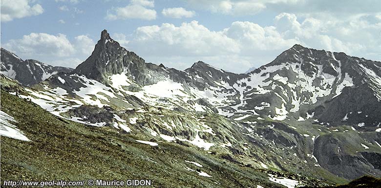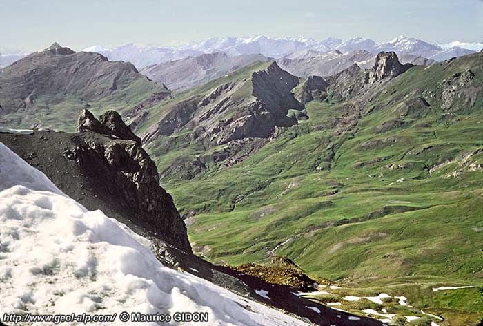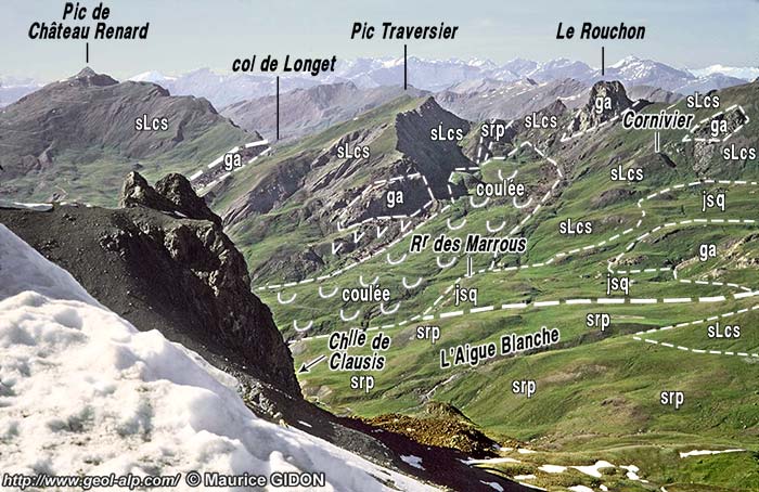 Au coin inférieur gauche on voit s'ébaucher la voûte anticlinale que dessine le plancher océanique des Lacs Blanchet, s'enfonçant sous les schistes lustrés du vallon du Blanchet puis sous les serpentinites des buttes d'alpages de Clausicet.
