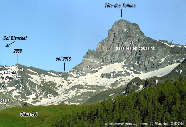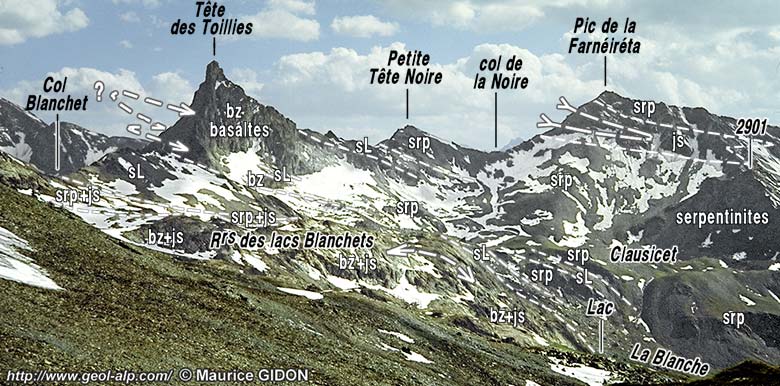 La voûte anticlinale que dessine la portion de plancher océanique des Lacs Blanchet (basaltes en coussins recouverts de marbres jurassiques = "bz+js") a été dénudée en roches moutonnées par le passage des glaciers qui ont occupé ce cirque. Du côté amont, dans le vallon Blanchet, cette voûte est recouverte par un anticlinal couché à coeur de serpentinites et couverture de marbres jurassiques ("srp+js").
