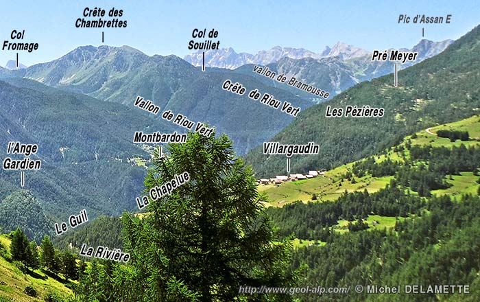 Plus au nord cette "bande gypso-cargneulique de Fontantie" rejoint le village de Souliers et se développe là jusqu'à atteindre une largeur de près de un kilomètre en traversant l'échine du Lac de la Roue (ce dernier est donc vraisemblablement un entonnoir de dissolution ouvert dans ces formations et colmaté par des alluvions glaciaires). Cette bande y est considérée comme le coussinet basal de charriage de l'unité d'Arvieux car elle en ceinture également la marge orientale jusqu'à rejoindre, au NE de Brunissard, les gypses et cargneules du col d'Izoard. En rive gauche (sud-orientale) du Guil la bande cargneuliqu de Fontantiee se poursuit vers le sud en s'élevant à flanc des pentes de Montbardon jusqu'aux alpages de Fontantie ; puis elle s'épanouit largement, plus au sud, aux abords ouest de la Pointe de la Selle (rive droite du ravin de Riou vert) et se rétrécit enfin pour déterminer le col de Fromage (voir la page "Bramousse"). |