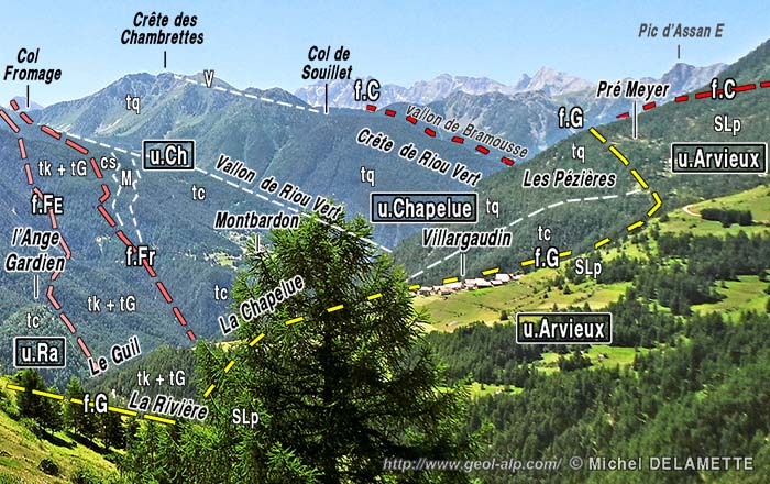 À l'aval de la traversée de cette bande gypso-cargneulique le Guil s'engage dans les gorges de la Chapelue qui constituent l'entrée amont de la succession de gorges de la "Combe du Queyras". Elles entaillent une épaisse succession des couches d'abord faiblement pentées vers l'ouest et qui s'infléchisent en un demi-voûte antiformr vers la sortie aval. Il s'agit en fait d'une série briançonnaise renversée, ses calcaires triasiques y étant recouverts par les quartzites eux-mêmes coiffés de Verrucano. Ceci s'observe aussi bien en rive droite (occidentale), dans l'échine de la Pignée - Pré Meyer - Les Pézières (au sud de Villargaudin), qu'en rive gauche, dans celle du Bois de Riou Vert. Comme cet ensemble est en outre limité à l'ouest par la cassure fortement pentée de la faille de Ceillac, qui y détermine le ravin du Veyer (voir la page "Croseras") on doit le considèrer comme un élément indépendant nommé l'unité de la Chapelue.