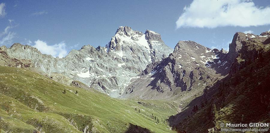 ![]() Le mont Viso et le vallon supérieur des sources du Guil, vus du sentier du refuge. noter la patine verdâtre des gabbros et celle brunâtre des schistes lustrés du versant occidental de la montagne. |