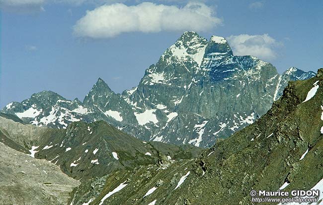 ![]() Le Mont Viso, versant occidental, vu du col de Chamoussière (par dessus le col Agnel et les crêtes de son versant italien). Les deux couloirs qui délimitent le Viso di Vallanta semblent bien correspondre à deux failles extensives conjuguées délimitant un horst* surélevé. |