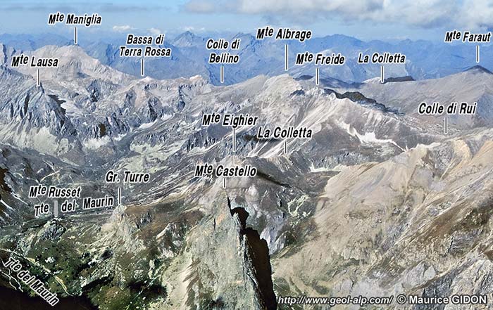 Les montagnes de rive gauche de la Valle del Maurin, à la latitude des grangie di Chiappera, vues du nord-ouest (presque dans l'enfilade de leurs axes structuraux) depuis le Monte La Ciarm.