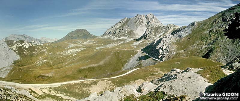 Le versant méridional du colle del Mulo et les entonnoirs de dissolution dans le gypse du versant oriental de la Testa di Bandia, vus de l'échine septentrionale de la Cima Piconiera.