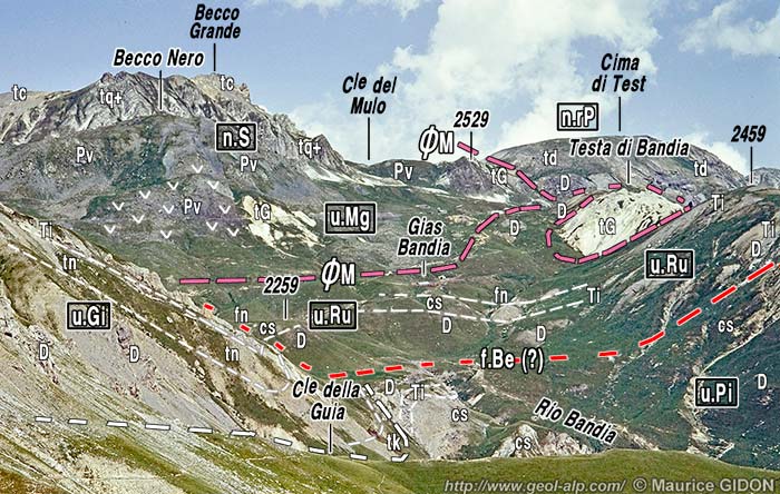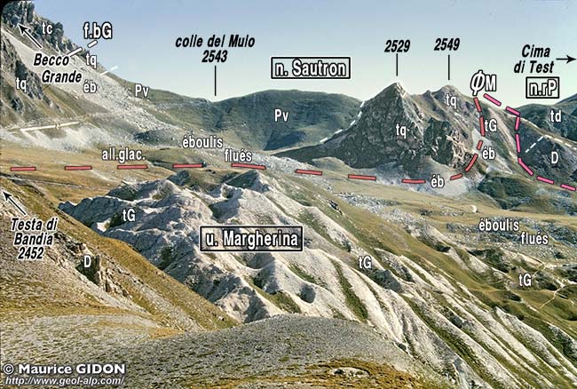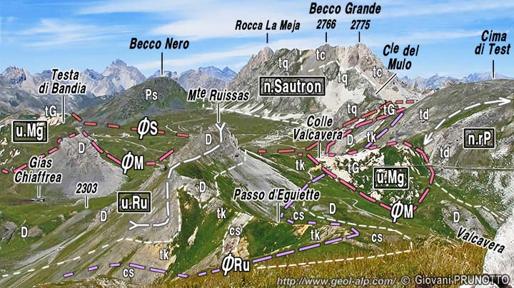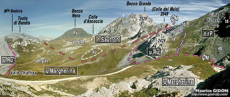 ØM = chevauchement de Margherina et du col del Mulo ; u.Ru = unité du Ruissas (couverture décollée du Trias dolomitique de l'anticlinal de la Cima di Test ?) ; n.rP = nappe de Rocca Peroni.