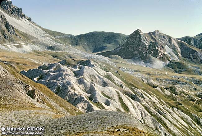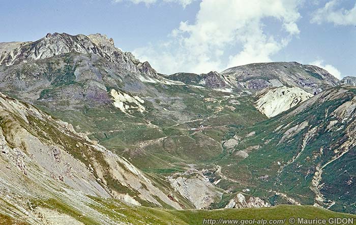 Coupe sur la transversale du colle del Mulo, selon la crête de partage des eaux entre val Chiaffrea et val Bandia.(extrait de la publication n° 059, M.GIDON 1972, présentation retouchée)