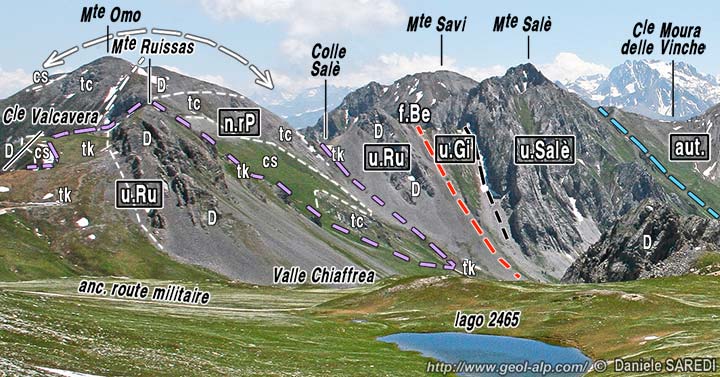 Le fait notable qui marque la transversale du vallon de Chiaffrea est que l'on voit réapparaître, sur sa rive gauche, un matériel calcaire briançonnais bien caractérisé par les calcaires triasiques qui constituent l'ample voûte anticlinale du Monte Omo. Or ce matériel affleure finalement dans le prolongement de celui, appartenant à la nappe de Rocca Peroni, qui avait disparu plus à l'ouest, au Colle Cologna.