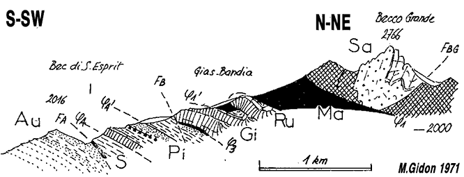 Coupe selon la transversale du colle Valcavera (extrait de la publication n° 059, M.GIDON 1972, présentation retouchée)