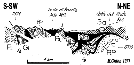 Sa = nappe de Sautron (FBG = faille du Becco Grande) ; Ø1 = surface de chevauchement de la nappe de Sautron (et des gypses de Margherina = Ø1') ; Ma =