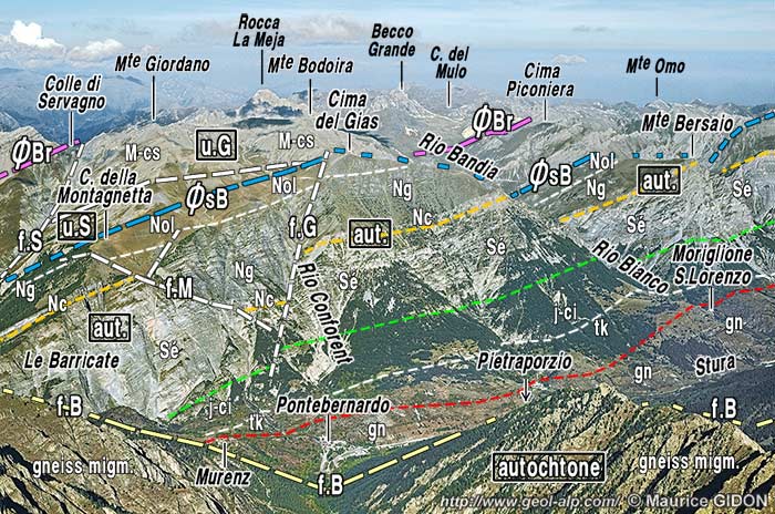 u.G = Unité (subbriançonnaise) du Giordano ; u.S = unité (subbriançonnaise) de Servagno ; aut = Autochtone.