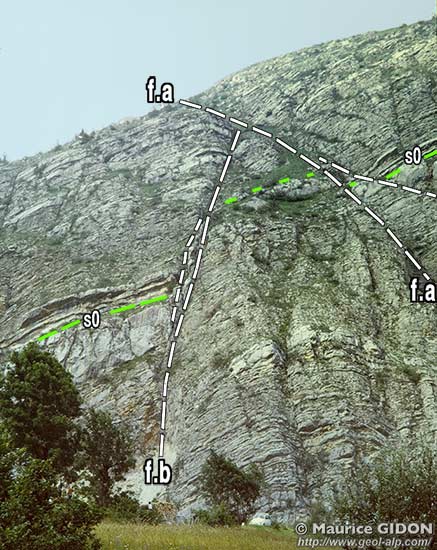 affleurements de Sénonien à l'entrée amont du défilé des Barricate montrant un bel exemple de failles extensives conjuguées (délimitant un bloc surélevé en "horst").