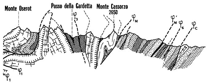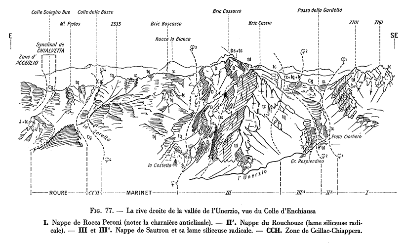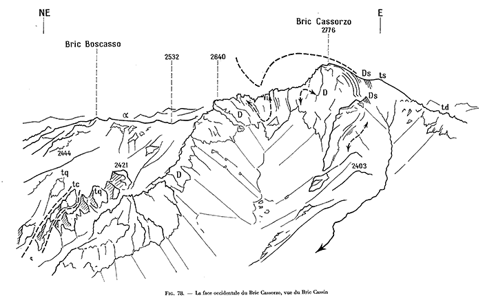Coupe d'ensemble passant peu à l'ouest du Monte Cassorzo (point 2650 de son arête NW) (extrait de la publication n° 024, M.GIDON 1962)