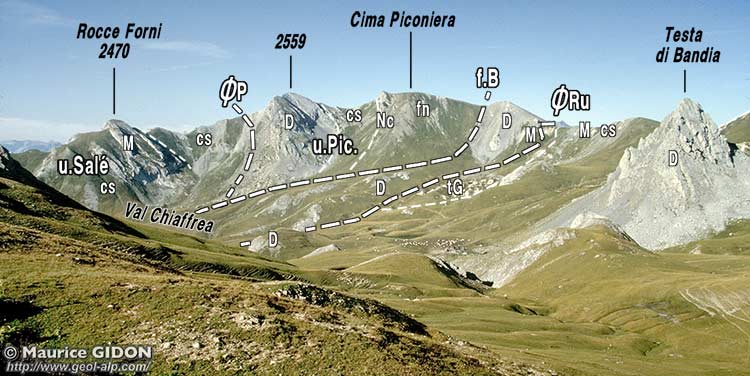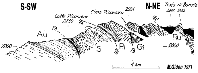 De la droite vers la gauche : Ru, Unités du Monte Ruissas et du Vallone Serour ; Gi, Unités du Giordano, du Val Chiaffrea, des Due Uomini et du Gias Rabbie ; f.B = faille du Bric Bernoir ; Pi, Unités de fa Piconiera et de Servagno ; S, unité du Salé ; f.A = accident de la limite entre nappes et autochtone (chevauchement ayant rejoué en faille extensive) ; Au, Autochtone.