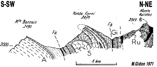 4 du schéma ci dessous) = surface de chevauchement de l'unité de la Piconiera ; f.B = faille du Bric Bernoir, séparant l'unité du Giordano de la précédente et sectionnant en biais cette dernière ; ØRu (=