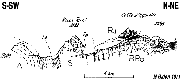 De la droite vers la gauche : Ru, Unités du Monte Ruissas et du Vallone Serour ; Gi, Unités du Giordano, du Val Chiaffrea, des Due Uomini et du Gias Rabbie ; f.B = faille du Bric Bernoir ; S, unité du Salé ; f.A = accident de la limite entre nappes et autochtone (chevauchement ayant rejoué en faille extensive) ; A, Autochtone.