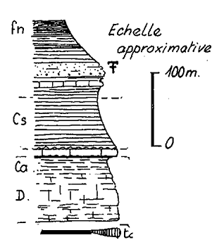 Colonne stratigraphique de l'unité de la Piconiera : succession subbriançonnaise de sillon mais avec Malm calcaire mince ; niveaux de microbrèches à Nummulites à la partie haute des marbres en plaquettes, sous le passage (transitionnel) au flysch noir. Abréviations : fn, Faciès « flysch noir », cs, Faciès calcschistes du Crétacé supérieur et de l'Éocène (br : brèches de niveaux divers) ; cm, Crétacé moyen ; ci, Néocomien ; M, Faciès calcaire du sommet du Malm (sil. : niveaux à silex) ; Ar, Calcaires argileux « argoviens », tn, Faciès « terres noires » (Oxfordien), Ca, « Callovien » ; D, Barre calcaire du Dogger ; Sin., Sinémurien (?) ; Het., Hettangien (?) ; Rh, Rhétien ; tk, Cargneules triasiques ; ts, Schistes, brèches et dolomies « postladiniennes » ; td, Dolomies ladiniennes ; tc, Calcaires anisiens. |