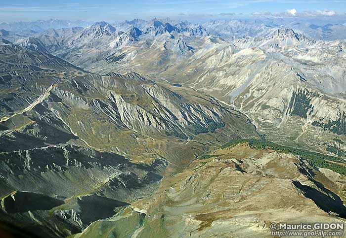 La rive nord du vallon de Ferrière, vue du sud depuis la Cime du Fer (au nord des lacs de Vens sur la crête frontière).