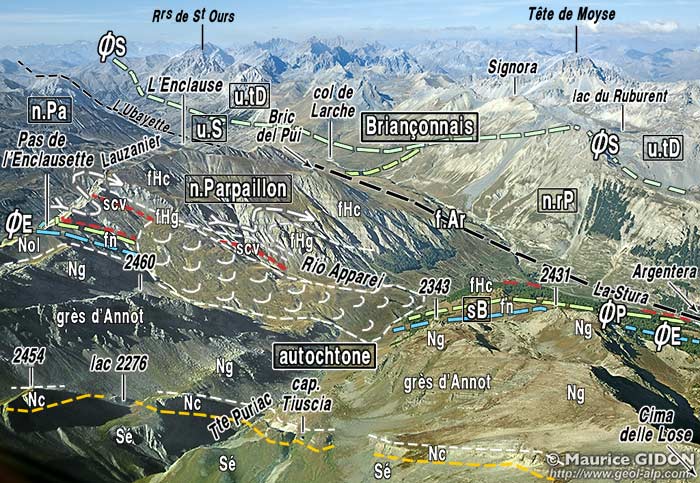 u.tD = unité briançonnaise de Tête Dure (nappe du Rouchouse ) ; n.rP = nappe de Rocca Peroni ; ØS = accident de Saint-Ours ; u.S = unité de Serenne ; f.Ar = faille d'Argentera ; n.P = nappe du Parpaillon ; sB = lame de matériel subbriançonnais (flysch noir surtout) ; ØE : surface de chevauchement des nappes de l'Embrunais.